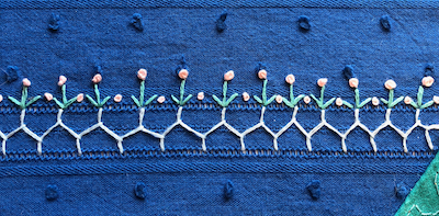 I embellished this printed fabric by stitching a Colonial knot on alternate green dots to form a ring around the rose. It somehow reminds me of a string of pearls. I could use this in a crazy quilt block. The thread used was again Pearl cotton number 8.