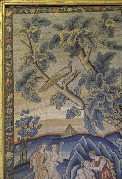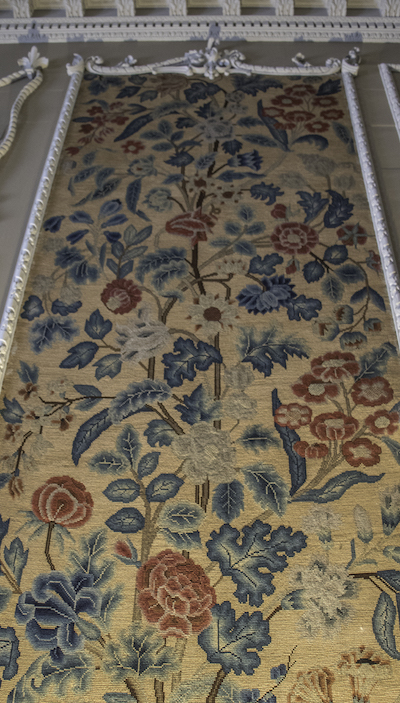 The Needlework Room was a real feast for the eye! Displayed on the walls were 10 huge needlepoint panels, reaching almost to the ceiling. They were worked in the early 1700s by Lady Julia Calverley, shown in the painted portrait to the right of the panels. As they only took 3 years to make, it is unlikely that she made them all herself! The central panel is dated 1717.