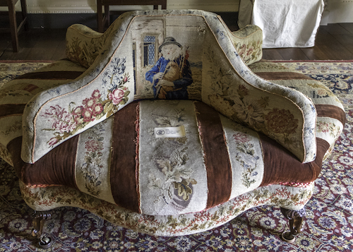 In addition, there was a more unusual seating arrangement in this room, known as a Conversation Seat, upon which 4 people could sit. The covers for this were also covered in needlepoint, albeit on different sizes of canvas.