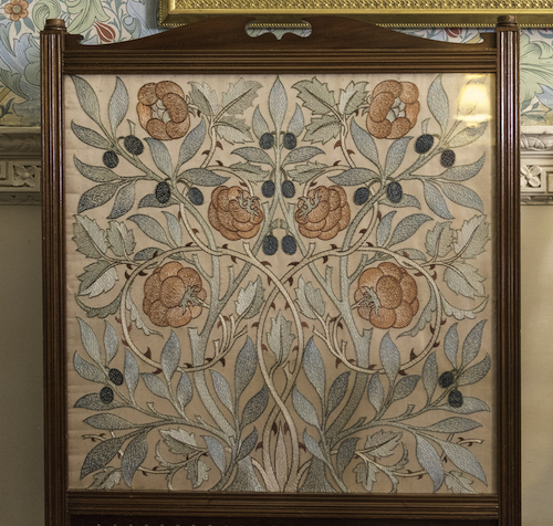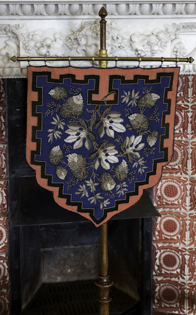 This unusual shield shaped banner again used tent stitch, some worked in metal threads. It stood in the Library and behind it was a Victorian cast iron grate and De Morgan tiles.