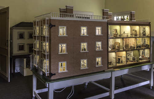 Hammond House, contained 36 rooms each lit by electric lights. It was inhabited by 77 1/12th scale dolls, including the master and mistress, their family and a full range of servants. Providing a record of life in the 1880s, it still contained the original wallpaper, floor coverings, furniture, china, glass, linen and even cutlery.