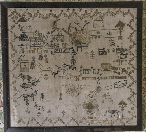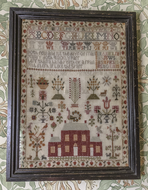 This first one was dated 1825, and is signed by a 13 year old girl. Sadly I couldn't quite decipher her name. Most of the work appeared to have been done in cross stitch, with a border below the red building in a satin stitch.