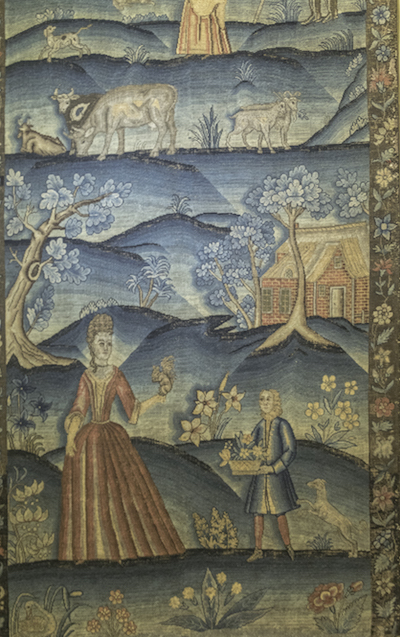 These panels were worked in petit point using wool. The designs were based on engravings by Wenceslaus Hollar, which in turn were created for a book of poems that was published in 1663.