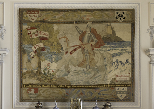 The knight on horseback depicted in the large needlepoint panel was the first Treveleyan, riding ashore at St Michael's Mount in Cornwall. Molly Trevelyan stitched it and took her 23 years to complete! A painting on another wall in this room shows Molly actually working on this piece.
