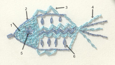 Also on that page you will find instructions for detached chain or lazy daisy stitch. This is used to create a daisy for your fish's eye and for decorating his body.