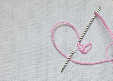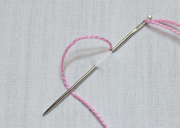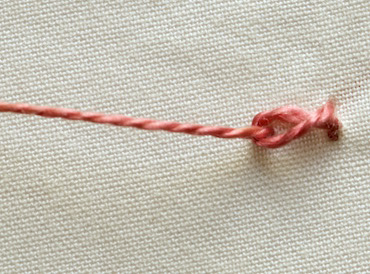 Fig 1 - Twisted chain stitchFor your first chain stitch bring your needle up through the fabric at the beginning of your outline. Insert it again right next to the original spot and bring it through the fabric about 5mm further along. Don't pull it through completely just yet.