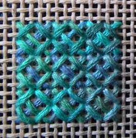A different effect entirely can be created if you only do the outermost of these three tie down stitches, as shown below. This sample was worked with the basic cross over 4 canvas threads, where those above were worked over 6.