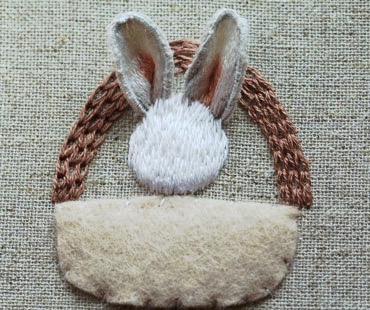 Then work out towards the edges with white long and short stitch. Don't worry about keeping the stitches too straight and even, they are supposed to be representing the rabbit's fur and look better if they are slightly untidy.