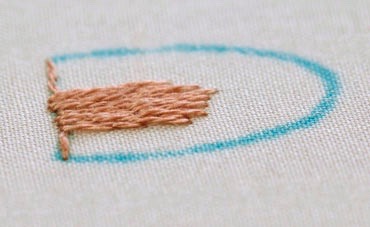 Stitch a row of backstitch around the outside edge of the ears. Starting in the centre, with 1 strand of peach floss, fill the center of the ear with long and short stitch, as shown in