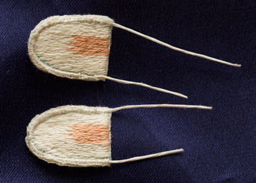 Fig 6 - Attaching the earsEmbroider the head with long and short stitch in one strand of white floss. In order not to flatten the padding, try to scoop the needle through the felt only, rather than going through all layers.