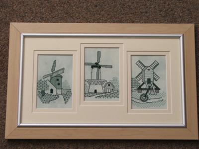 Our school secretary was due to retire, and her favourite holiday destination was Holland, so I decided to stitch the three blackwork Dutch Windmills as a trio, but matched the colours to her living room, which is mainly greens. Needless to say, she loved the stitching, and has pride of place in her living room.